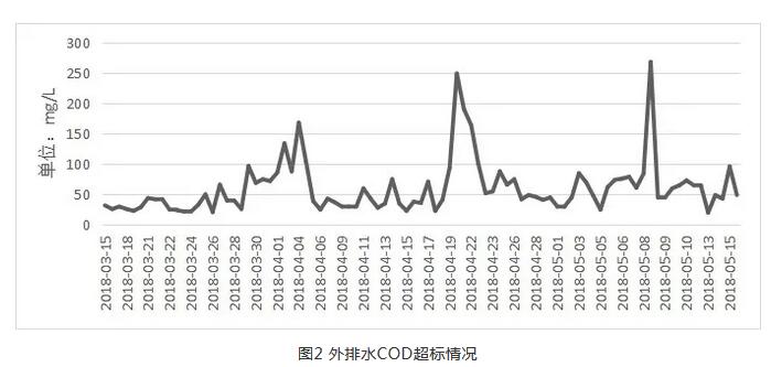 圖2為2018年3月-5月外排水COD化驗數(shù)據(jù),醫(yī)用GMP純化水設(shè)備超標(biāo)情況頻繁,COD超標(biāo)時呈爆發(fā)式上升,更換濾芯后可快速恢復(fù)。
