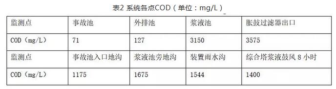 針對細(xì)菌污染,對水處理單元事故池(廢水回收池)、外排池、漿液池等均做了COD分析,查找污染源并分析細(xì)菌污染過程。表2為水處理系統(tǒng)各點采樣分析數(shù)據(jù)。