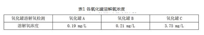 COD超標(biāo)期間檢測了各氧化罐出口溶解氧濃度,見表1