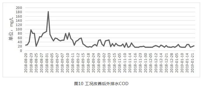 圖10 為工況改善后外排水COD,如圖所示,COD可以控制在25 mg/L以下,且可以長期保持。