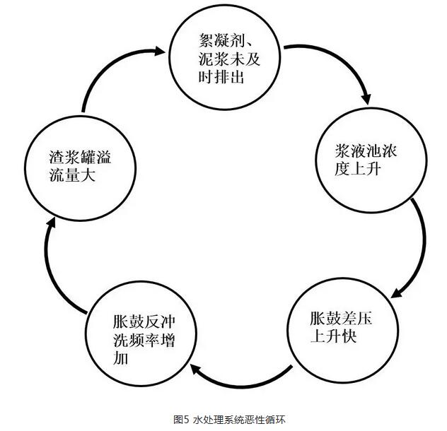 本裝置脹鼓過濾器兩開一備,定時反沖洗,每次反沖洗量為3噸,反沖頻率為2小時每次。兩組脹鼓過濾器24小時反沖洗量約為80噸。渣漿罐容量為15噸,每白班下料一次,下料量約為8噸。由于泥漿具有粘性,醫(yī)用GMP純化水設(shè)備渣漿罐攪拌泵持續(xù)運行,渣漿罐內(nèi)泥漿無提濃效果,脹鼓過濾器反沖洗泥漿90%從渣漿罐頂部溢流返回漿液池。絮凝劑跟隨泥漿返混,在水處理系統(tǒng)內(nèi)富集,使?jié){液粘性增加。以上原因造成惡性循環(huán),見圖5。